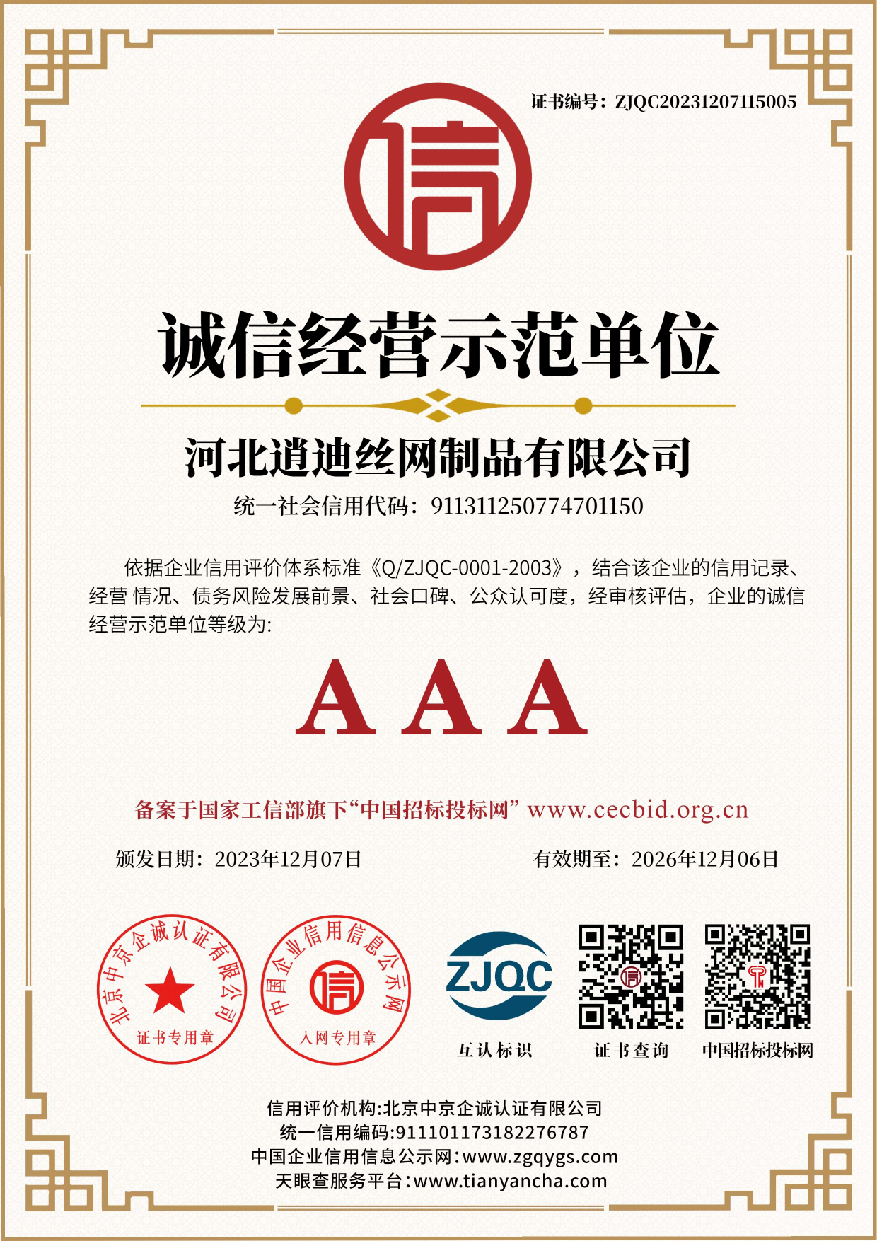 誠信經(jīng)營示范單位-河北逍迪絲網(wǎng)制品有限公司