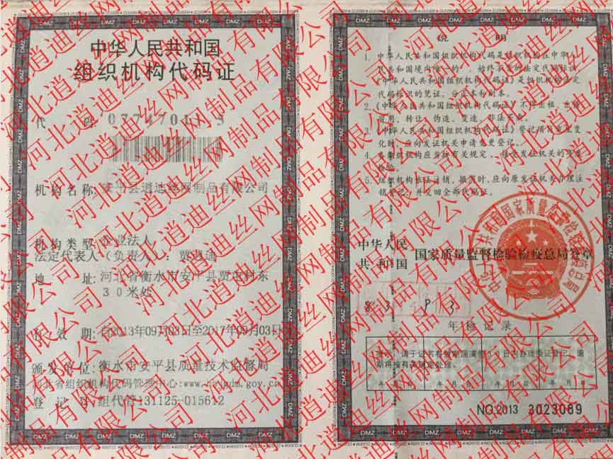 河北逍迪絲網(wǎng)制品有限公司老證件現(xiàn)在都是三證合一沒有此證了,但是目前還有客戶需要次證件